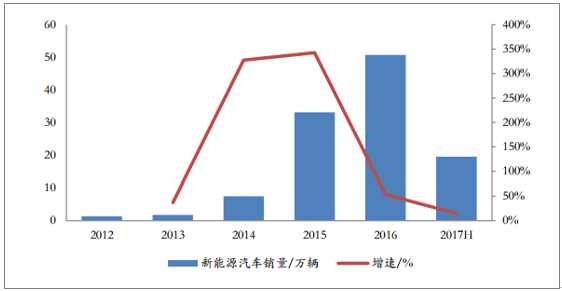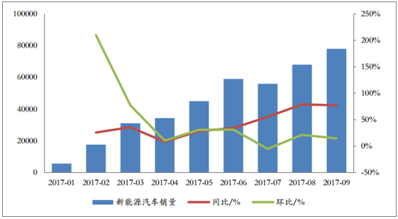 從2015年起我國新能源汽車進入快速發展期,各項產業政策和資本運作層出不窮,2016年我國新能源汽車銷量達到50.7萬輛,較2012年的1.3萬輛,增長了近40倍。2016年底,財政部、科技部、工信部和發改委聯合發布《關于調整新能源汽車推廣應用財政補貼政策的通知》,對新能源汽車不提方式進行了調整細化,并適度降低了補貼力度。2017年1月,工信部發布了《新能源汽車生產企業及產品準入管理規定》。2017年3月,財政部聯合相關部委印發了《關于開展2016年新能源汽車補貼》,再次調整了新能源汽車的推廣措施。雖然新的補貼政策造成了補貼滑坡,影響了年初的新能源汽車銷量。但隨著新能源汽車推薦目錄重新發布、地方補貼政策陸續出臺以及雙積分政策的落地,新能源汽車銷量回暖,2017年前九個月國內新能源汽車銷量累計達到39.8萬輛,同比增長37.72%。新能源汽車產業逐漸度過陣痛期,朝著健康長期的方向文件發展,繼續維持高速增長。
